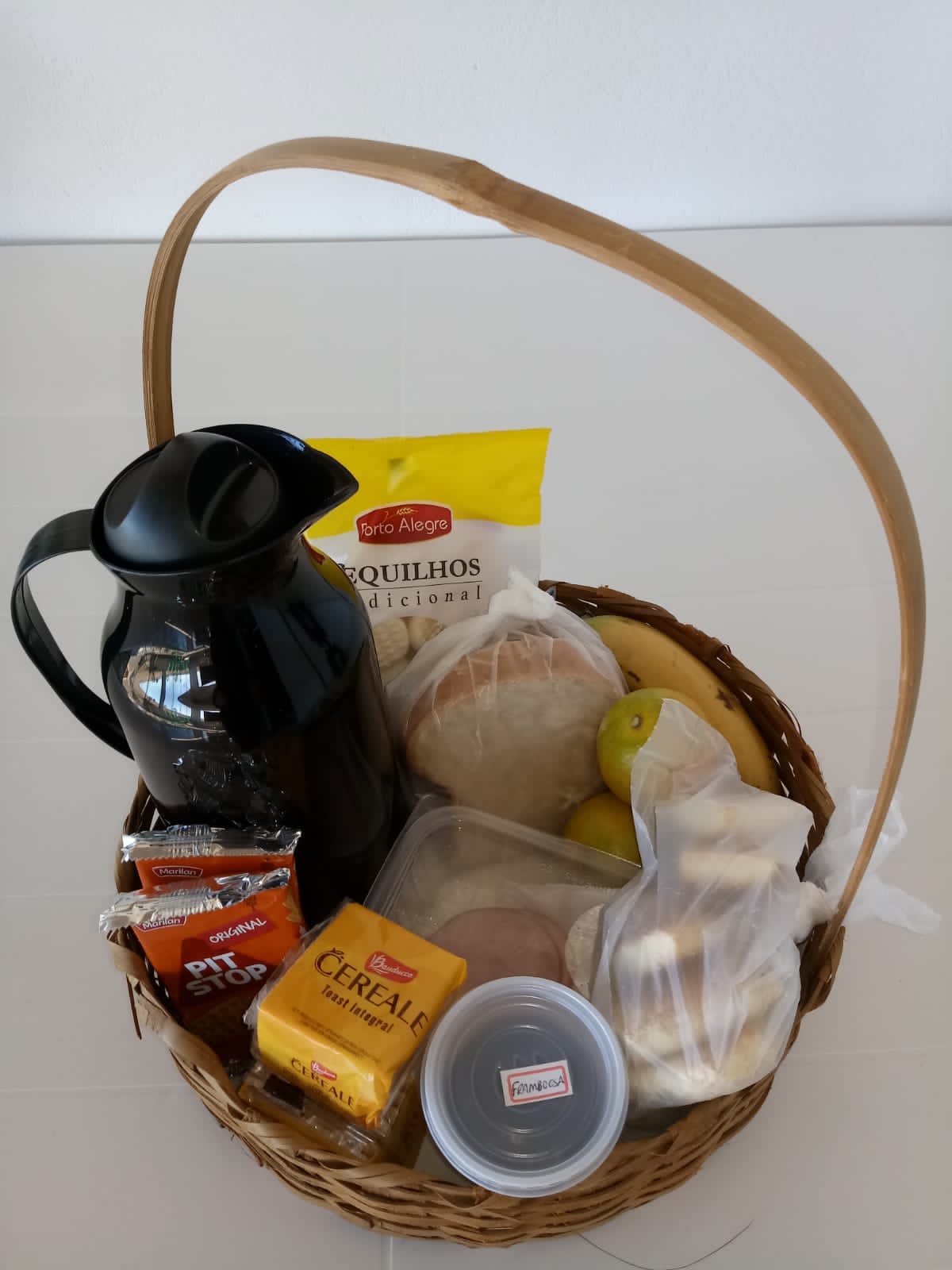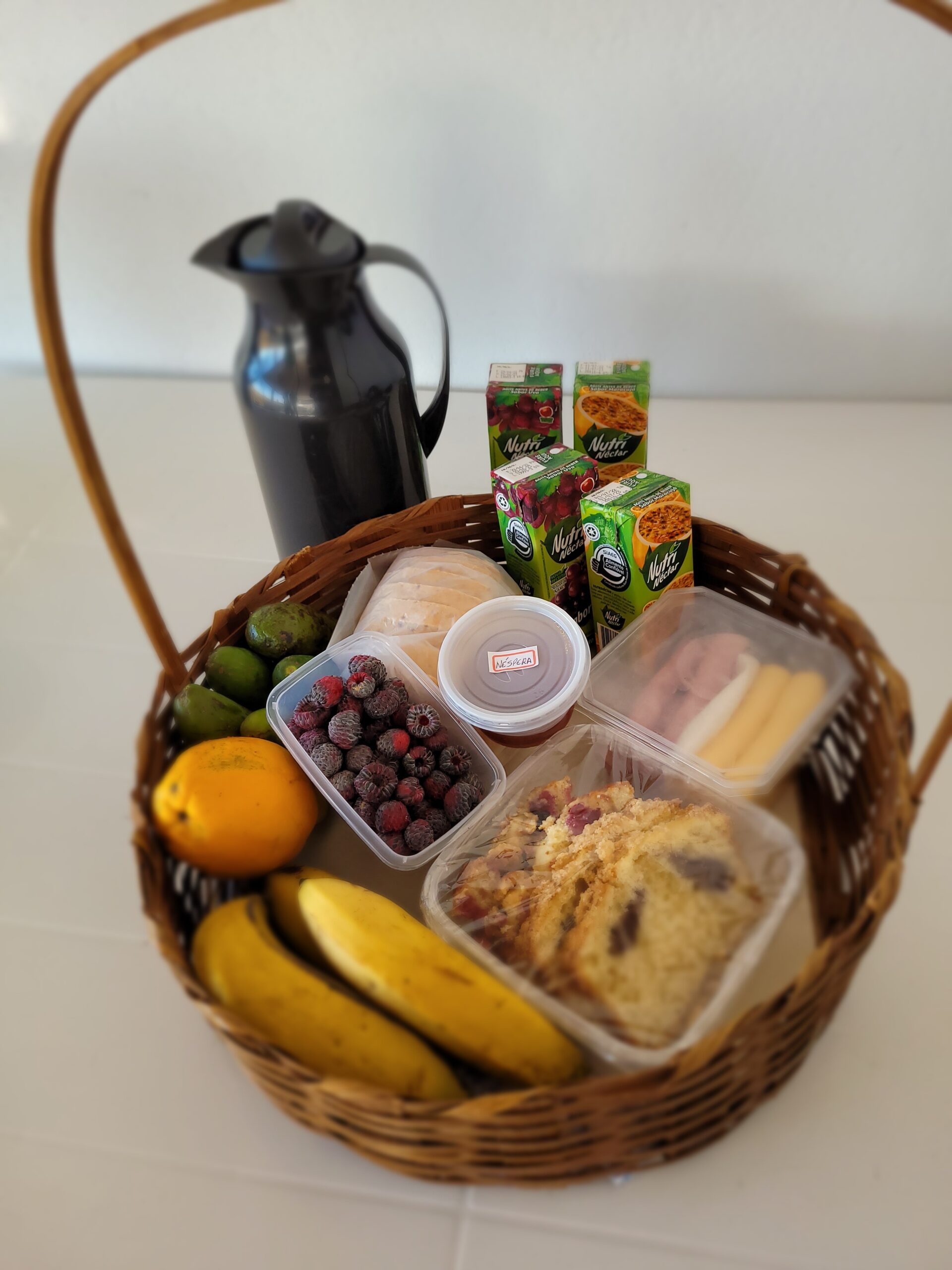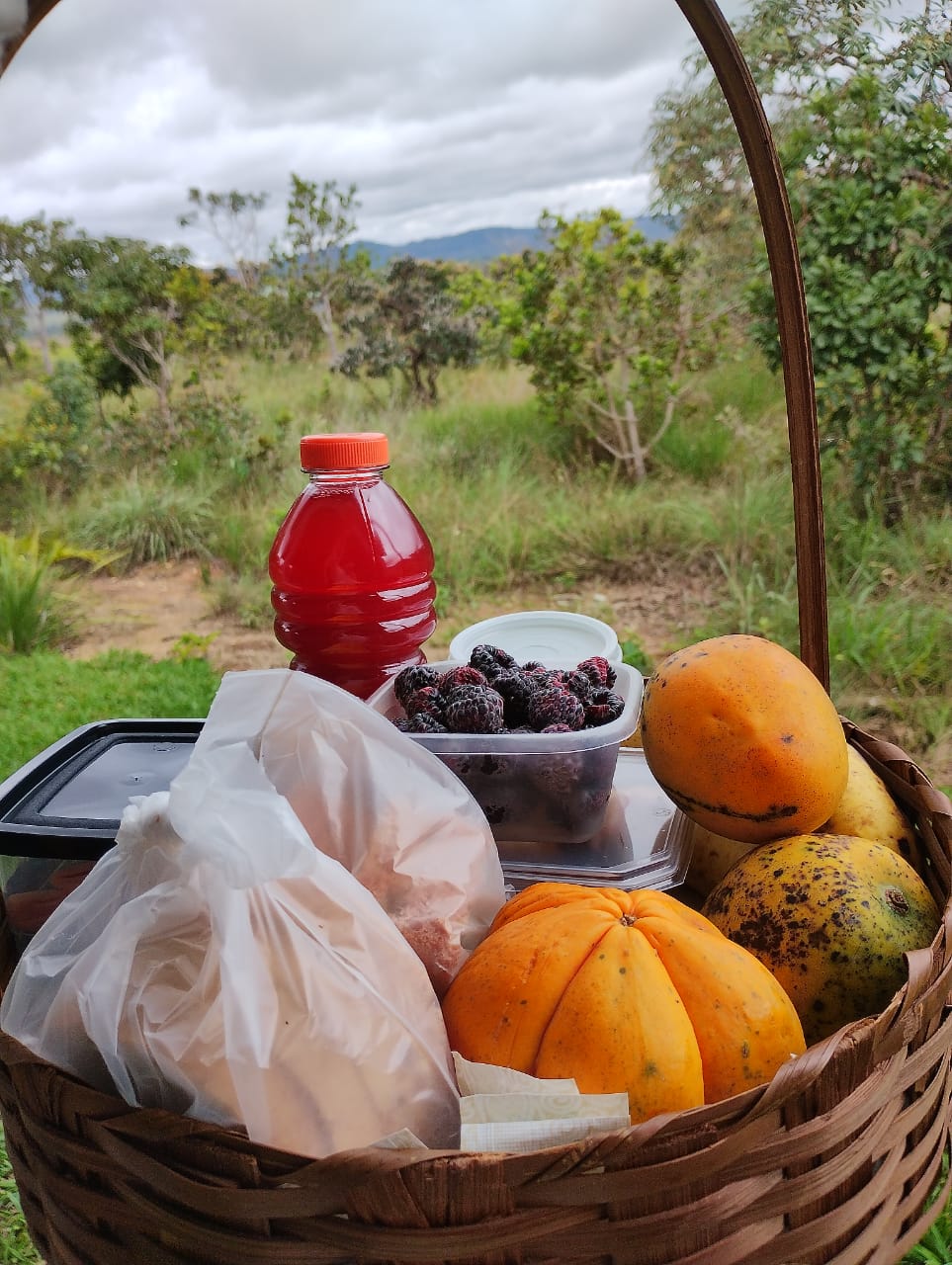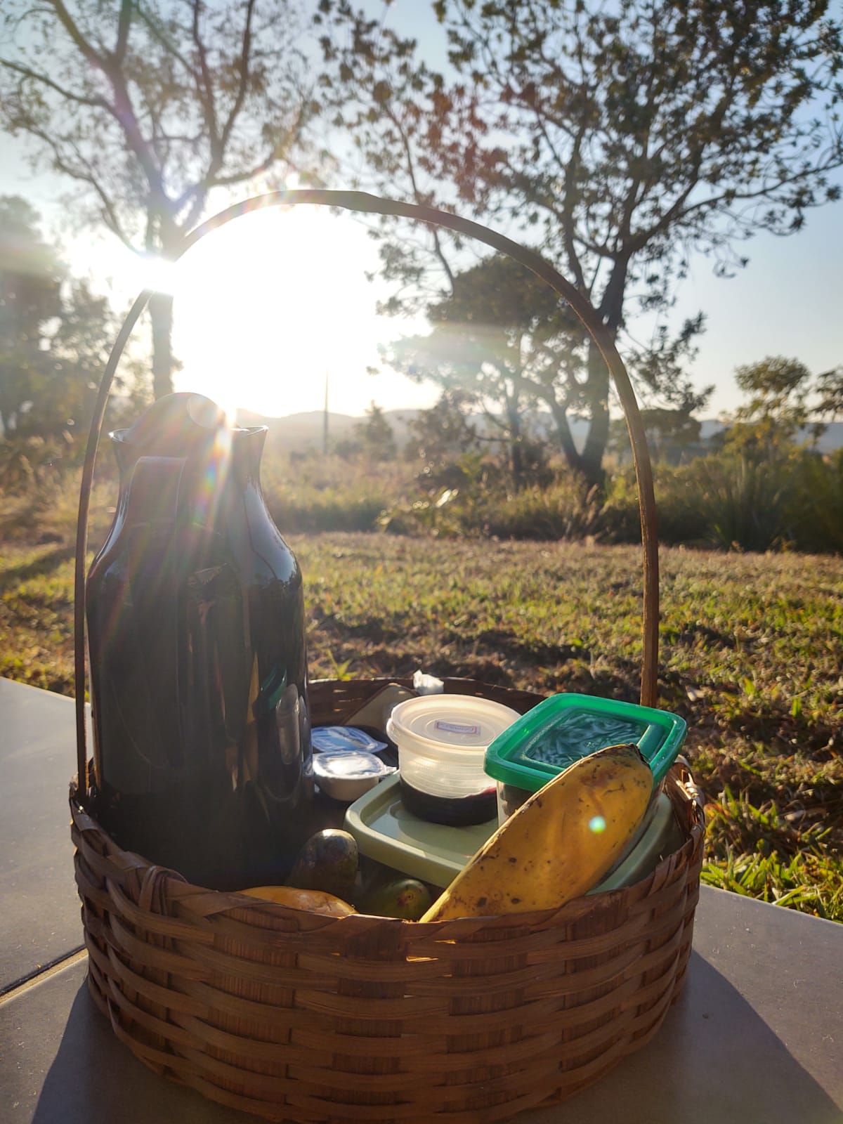 O café da manhã é entregue no chalé através de uma cesta com produtos artesanais e orgânicos da fazenda.