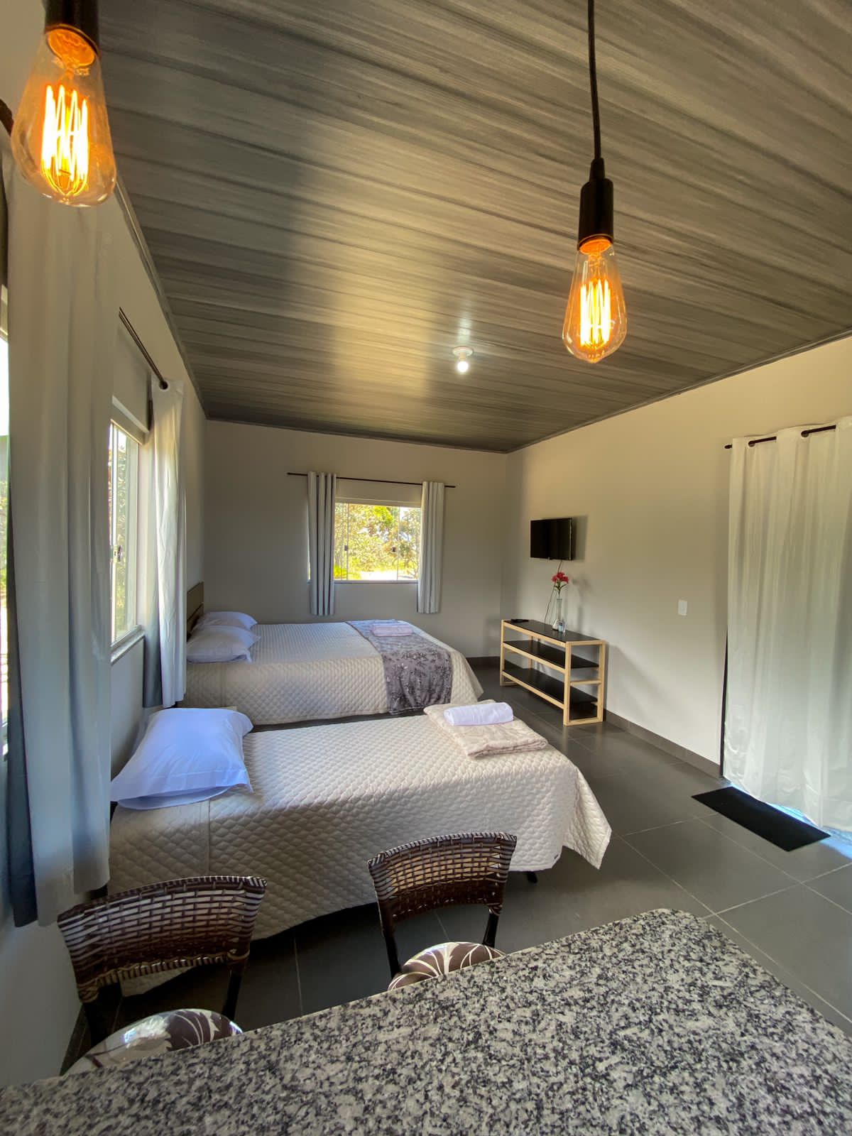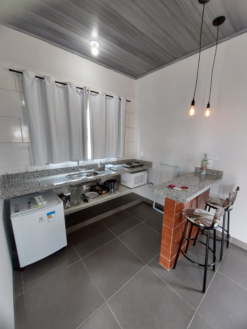 chalés contam com cozinha equipada, roupa de cama e de banho. Há também redes para que