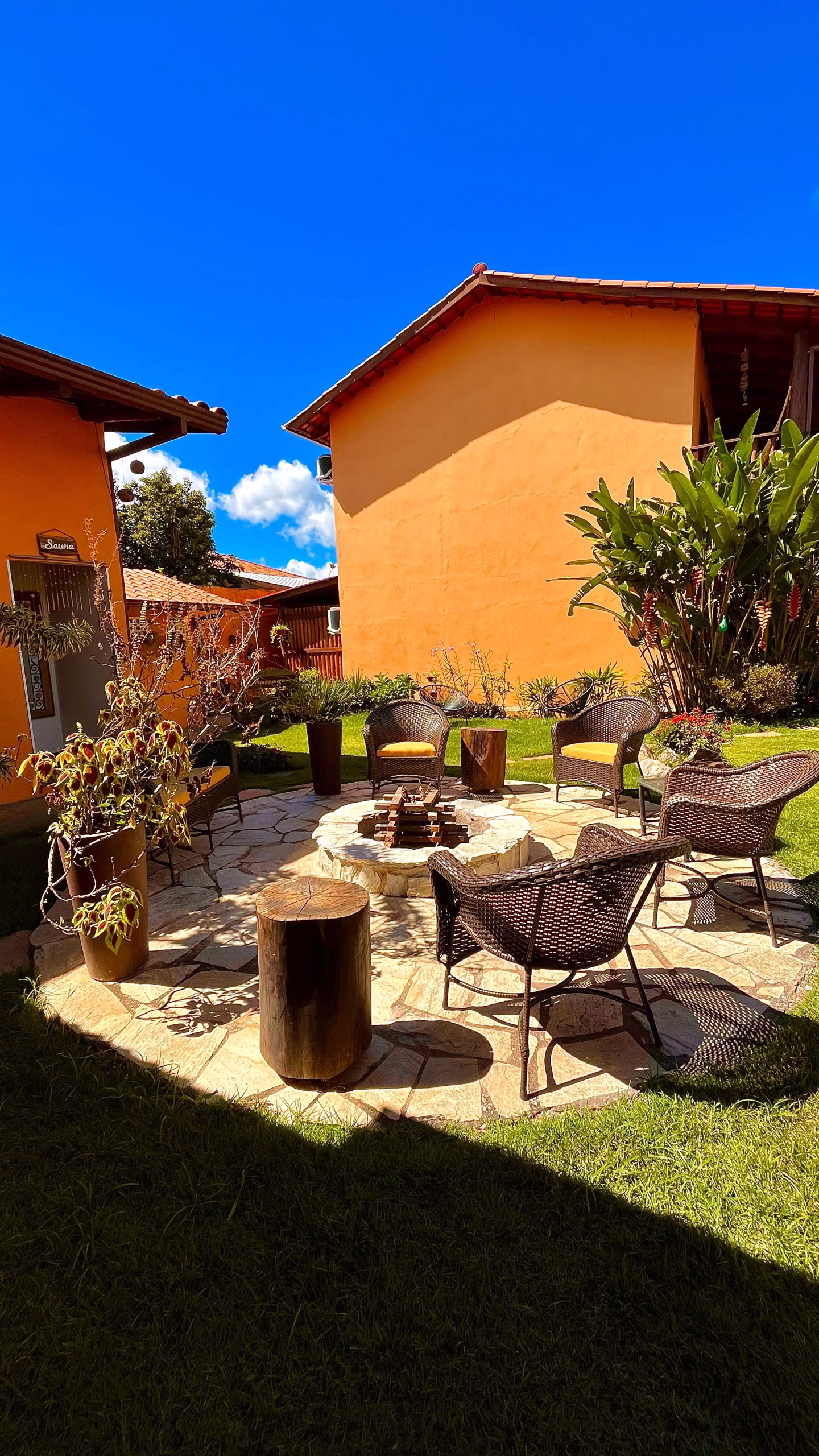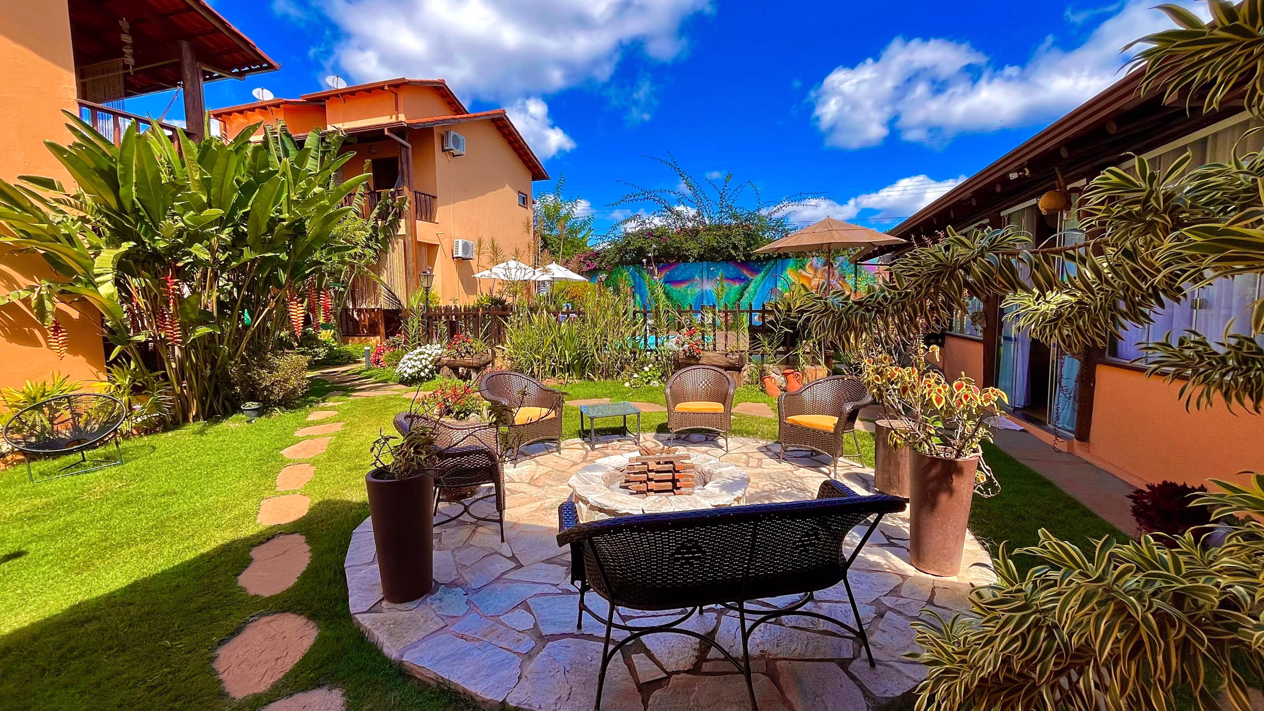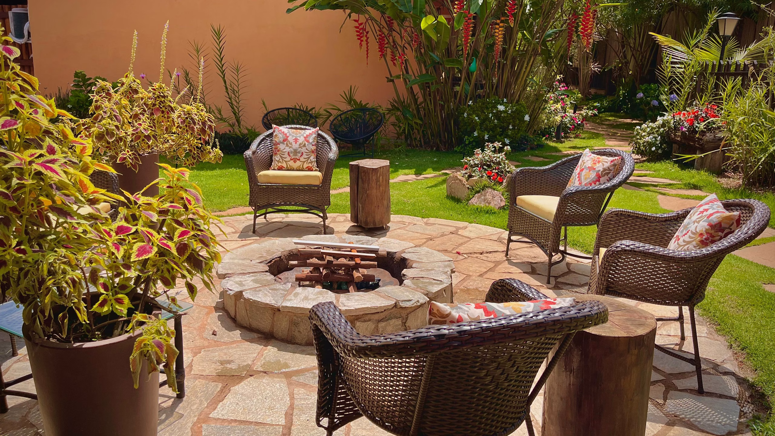 espaço para fogueira que é acesa todas as noites e um lindo jardim que pode ser apreciado das