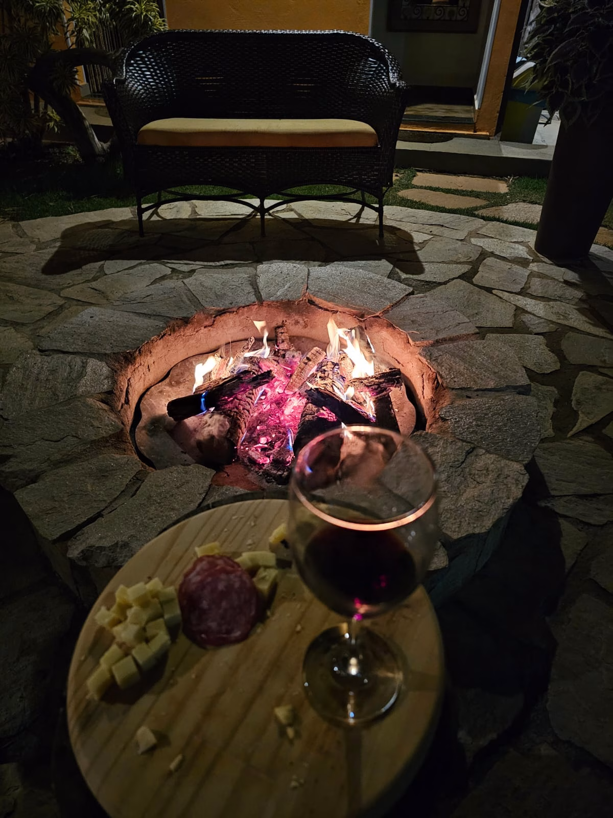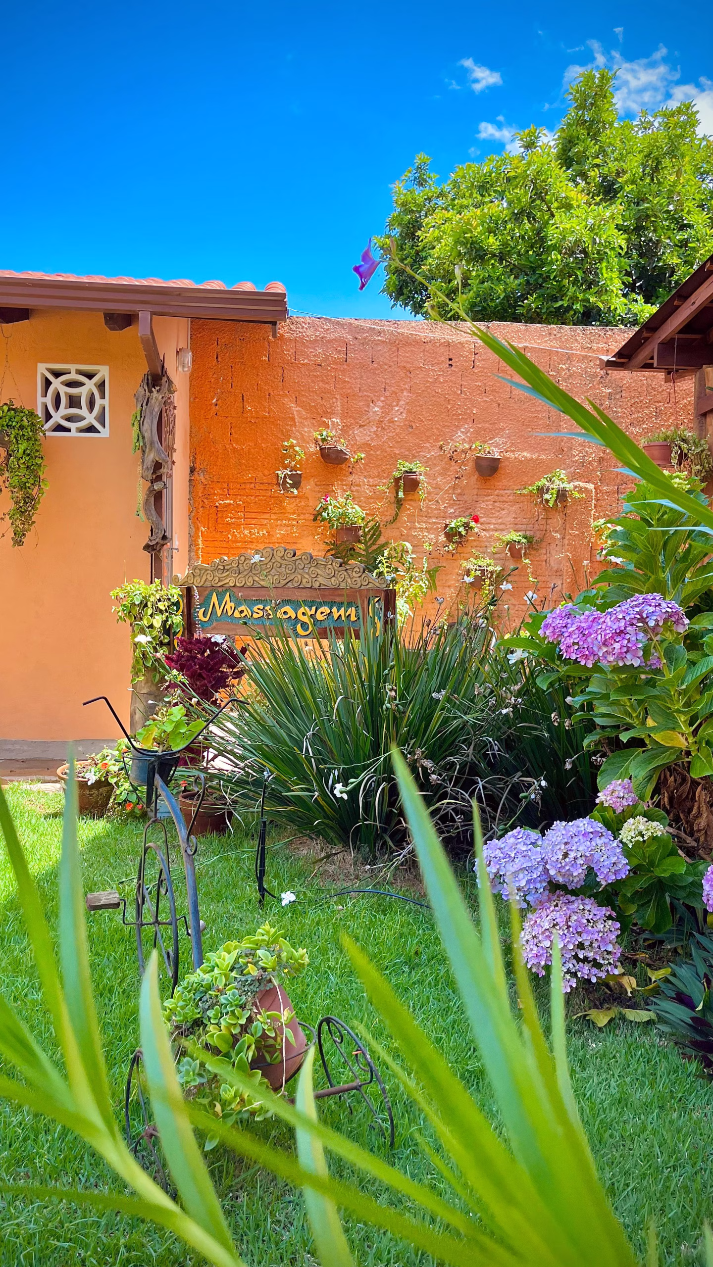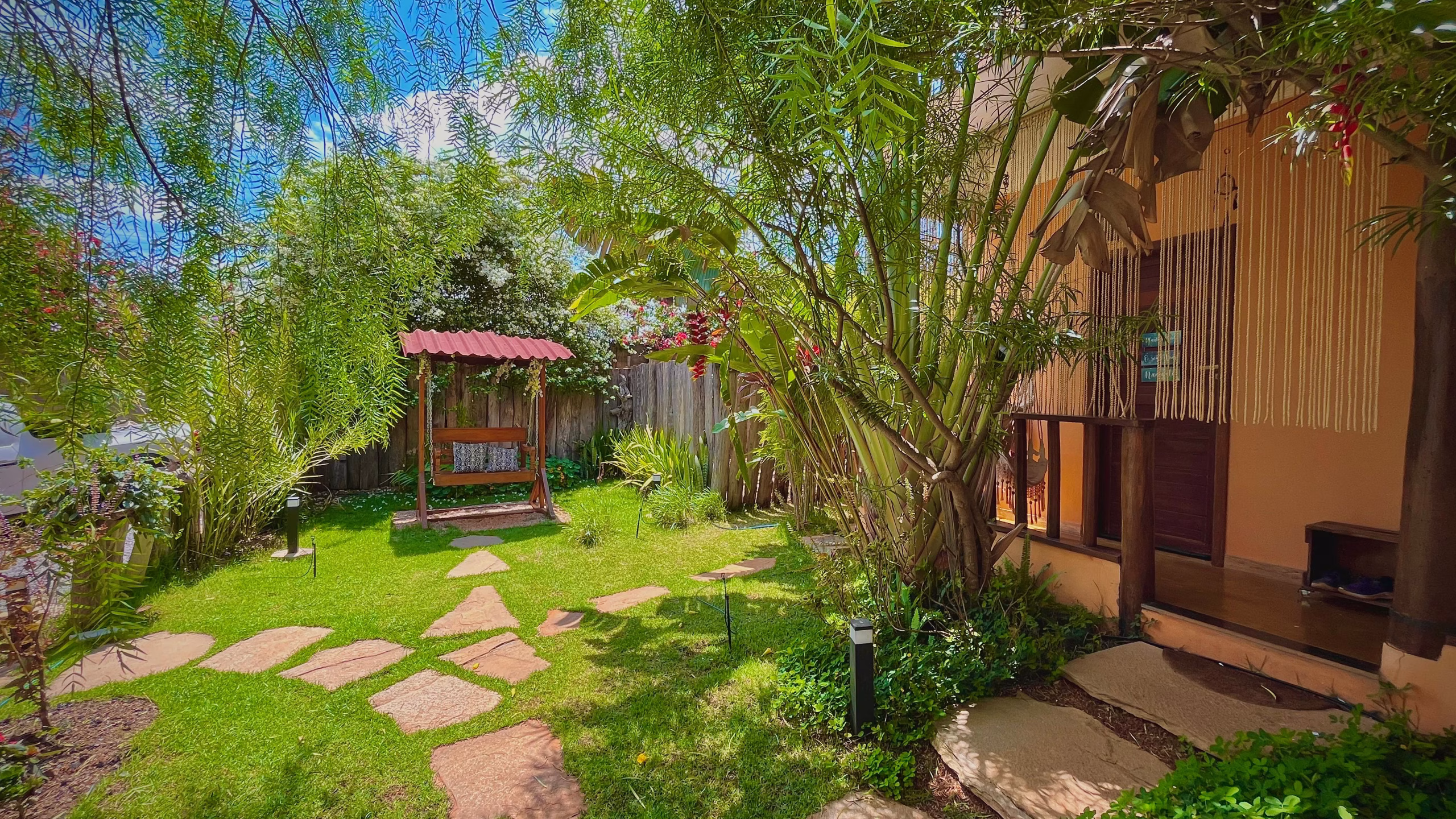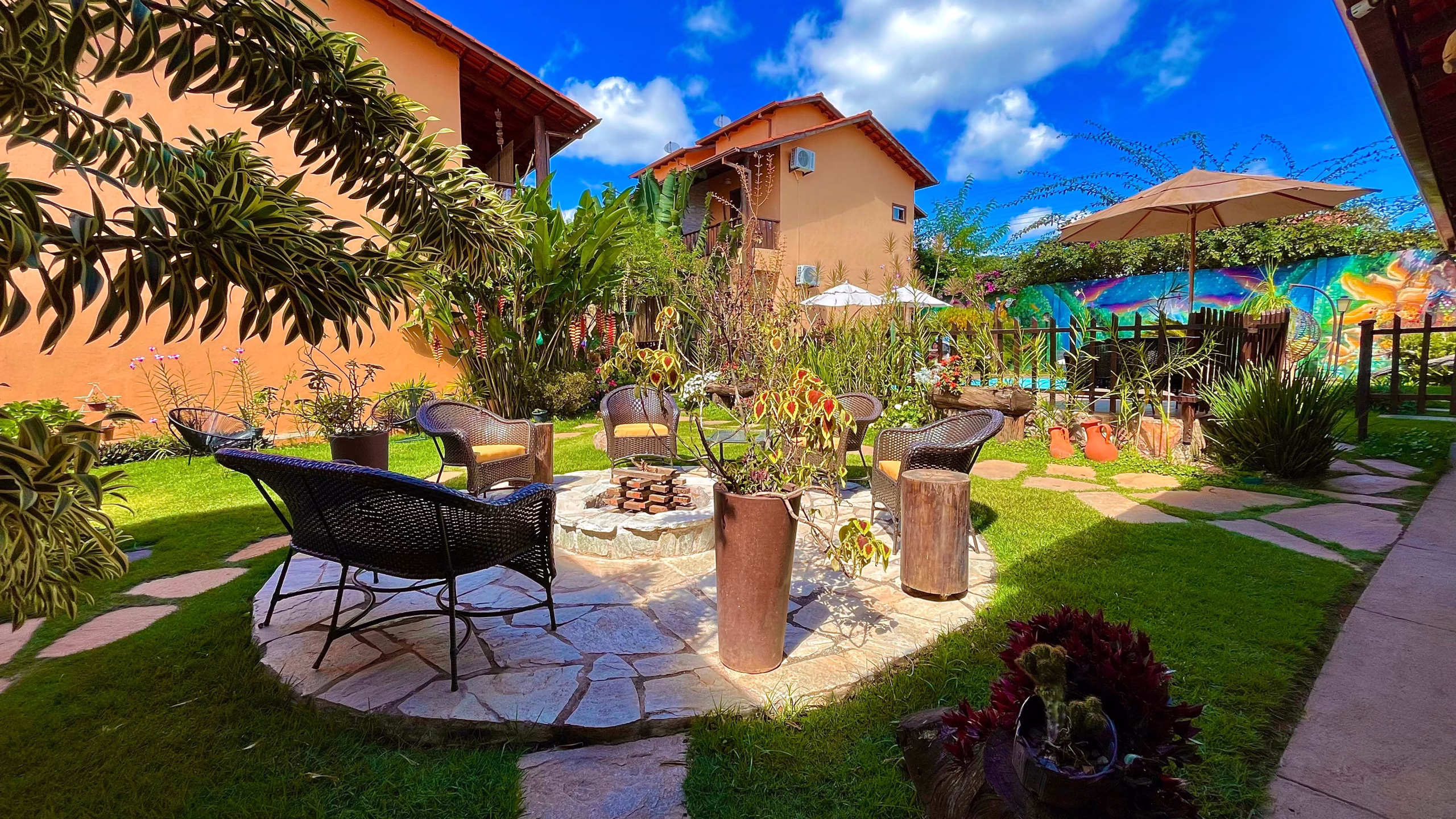 espaço para fogueira que é acesa todas as noites e um lindo jardim que pode ser apreciado das