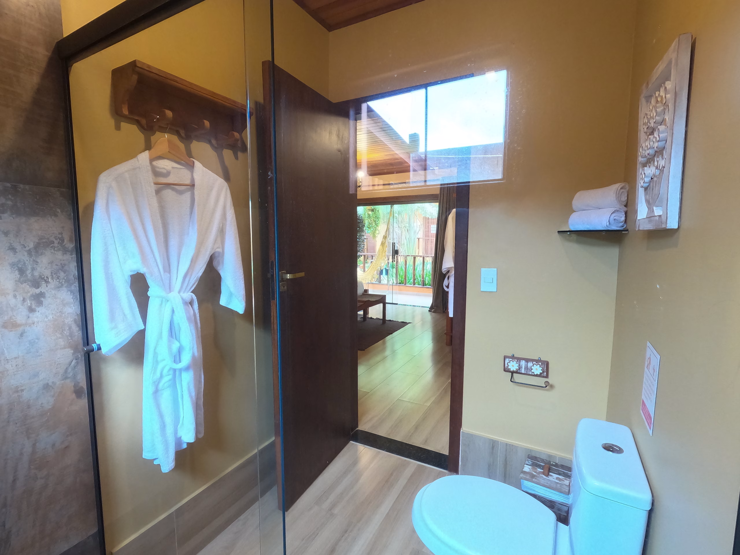 banheiro privativo com agua quente solar no lavatório e chuveiro e roupões atoalhados.