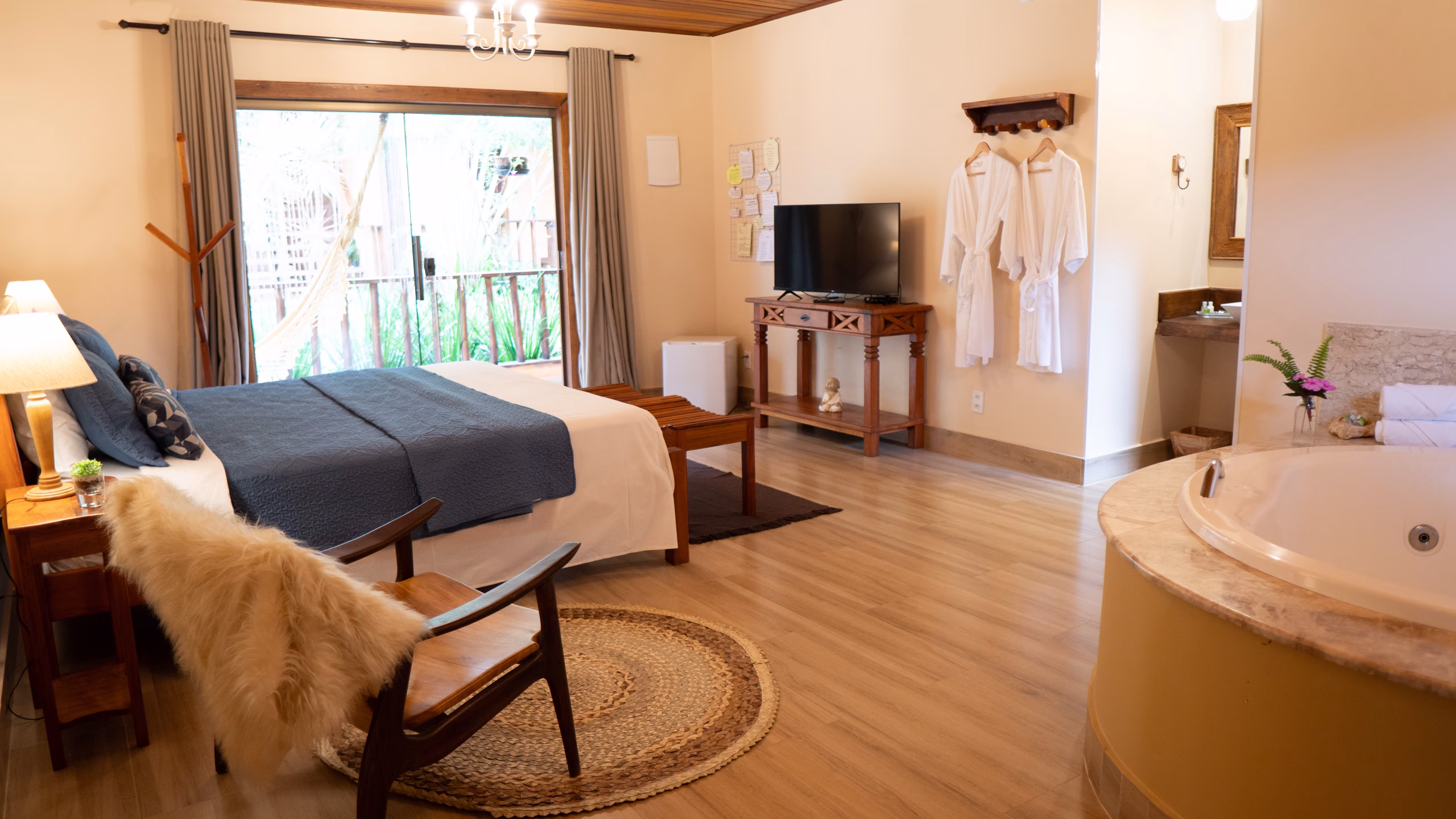 de solteiro) e Suíte Master com uma cama king e banheira de hidromassagem.