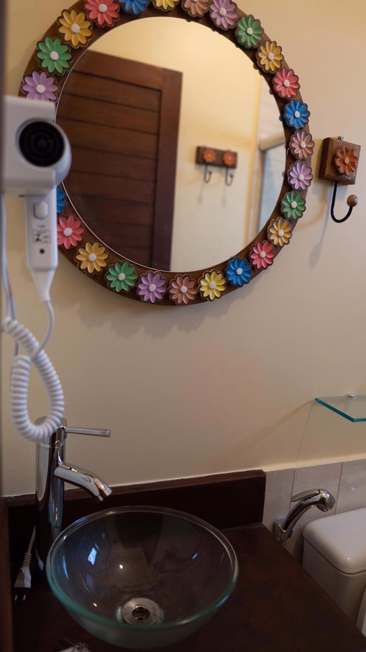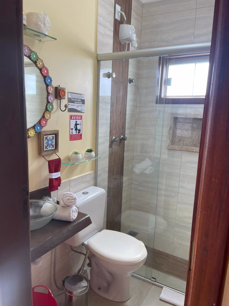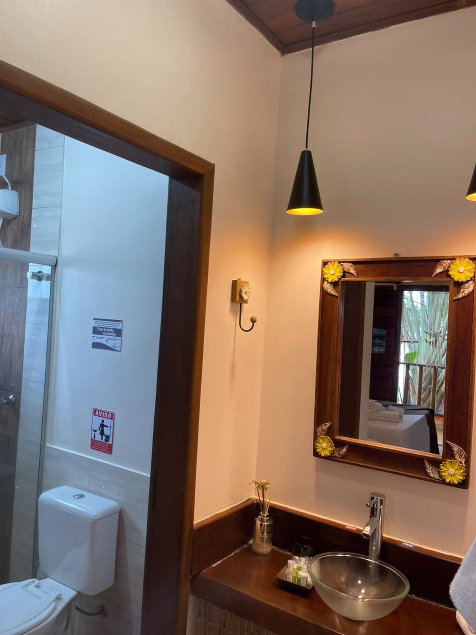 frigobar, secador de cabelo e banheiro privativo com água quente solar no lavatório e chuveiro