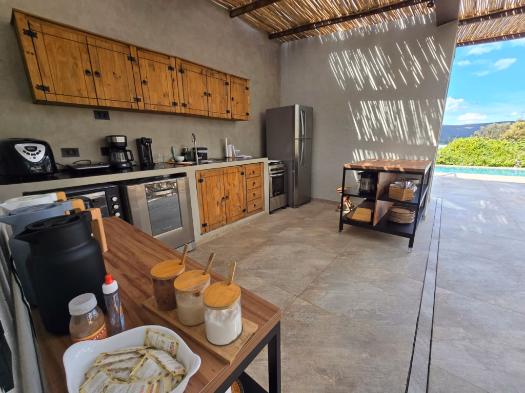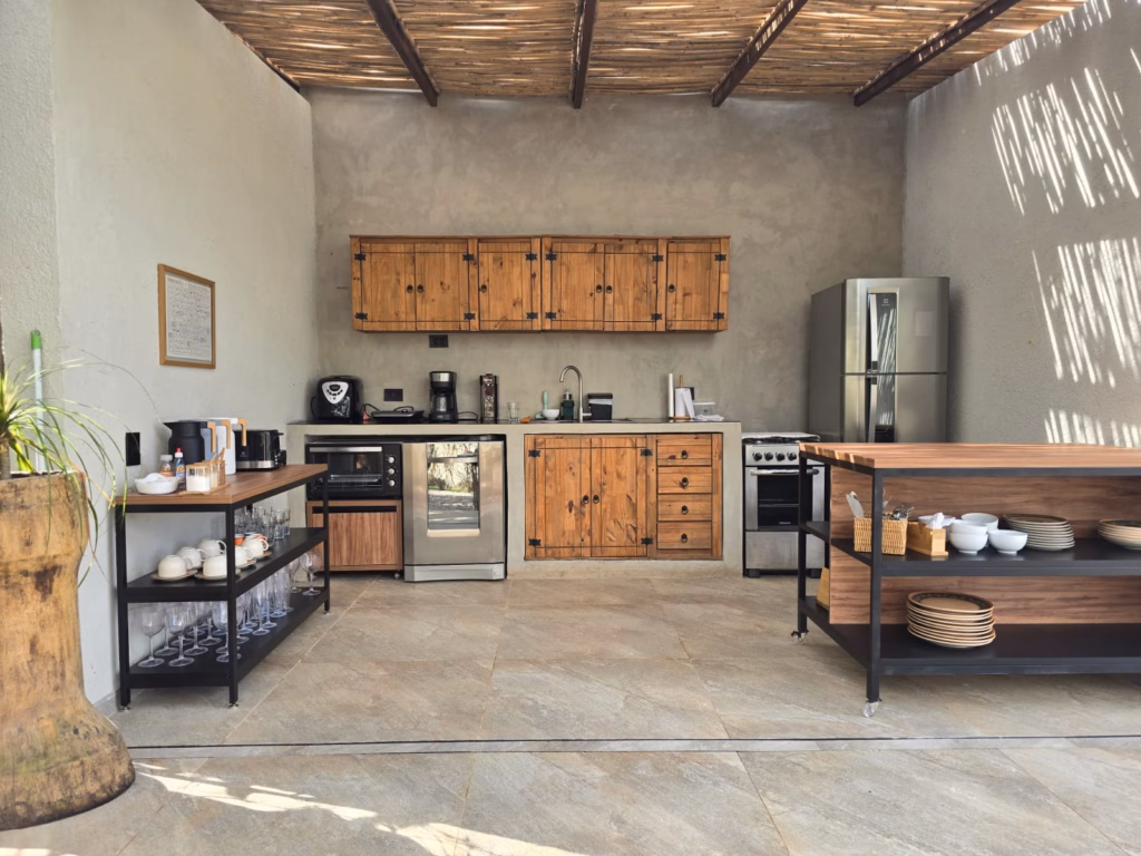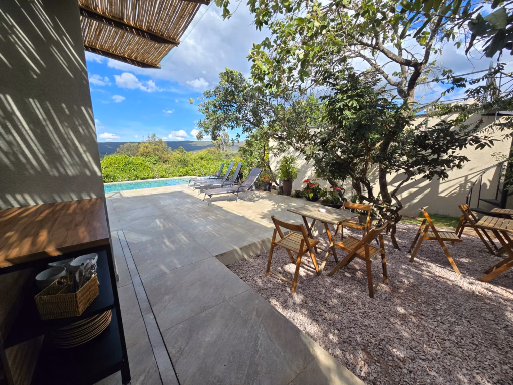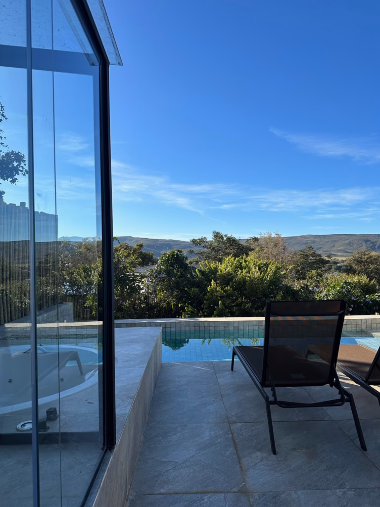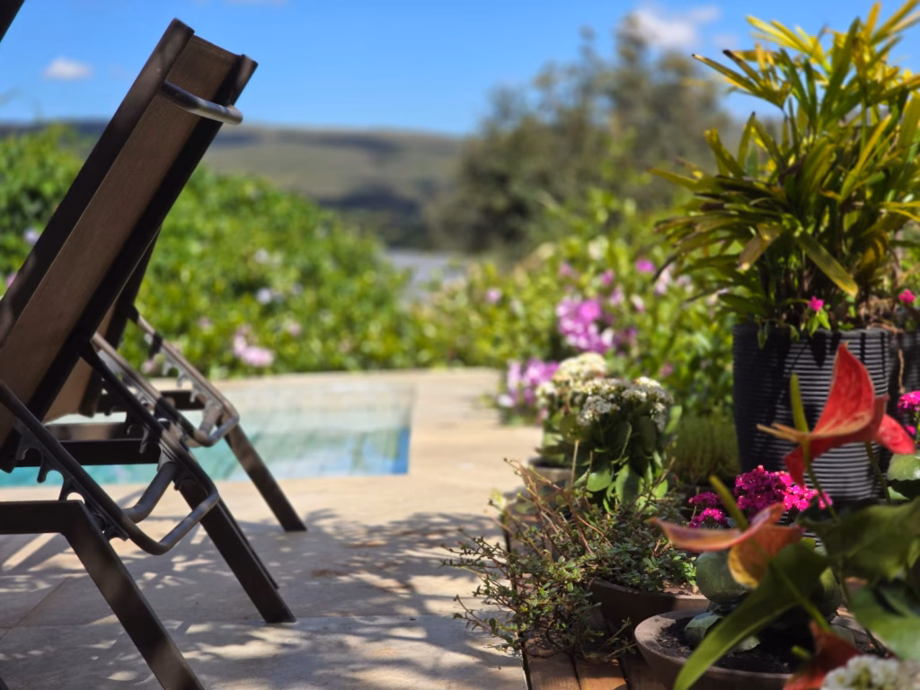 Na área comum com vista para as montanhas, a pousada oferece estrutura de spa com piscina climatizada, sauna a vapor e jacuzzi para uso livre de nossos hóspedes até as 22h00, além de um deck panorâmico para relaxar, assistir ao espetáculo do nascer do sol e da lua cheia, ou tomar uma boa taça de vinho apreciando as estrelas da Chapada dos Veadeiros.