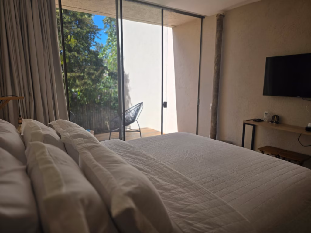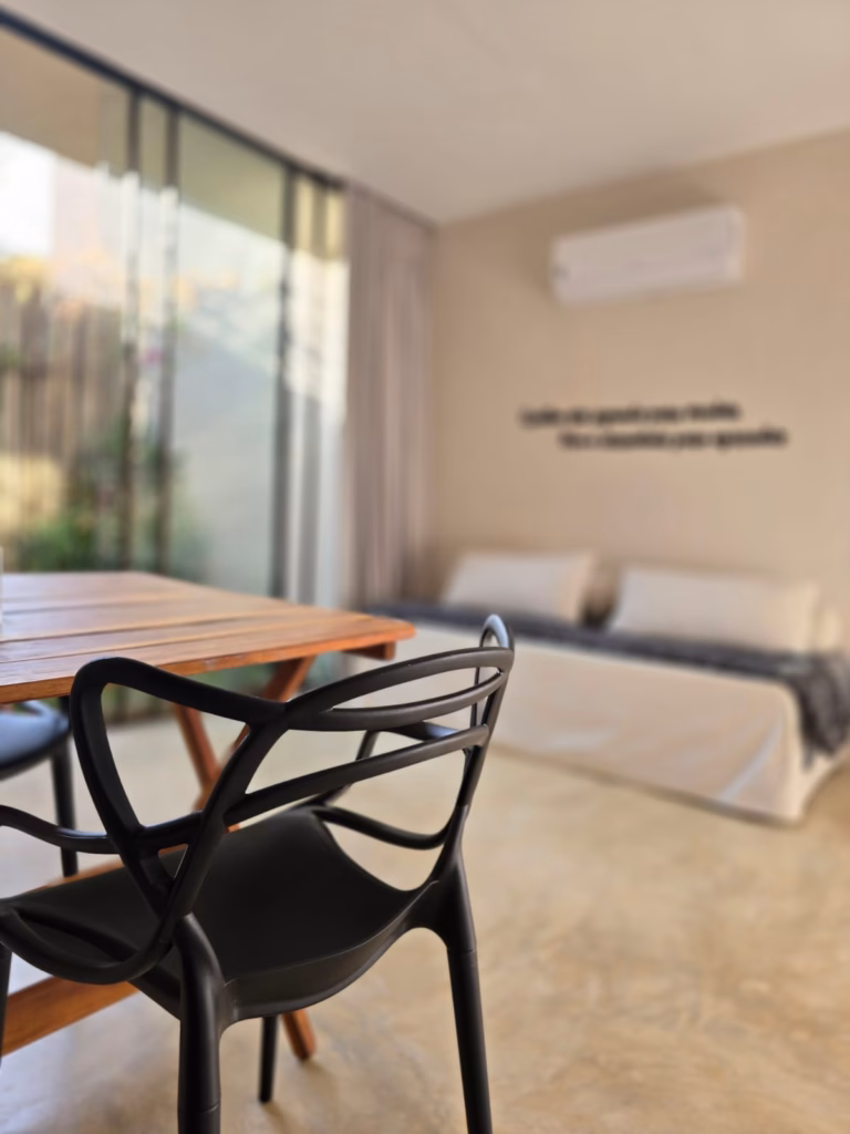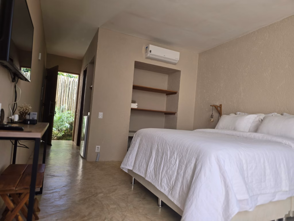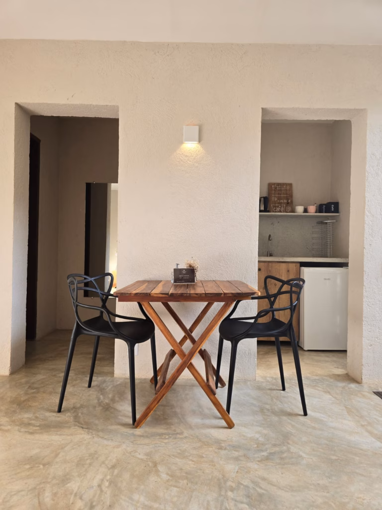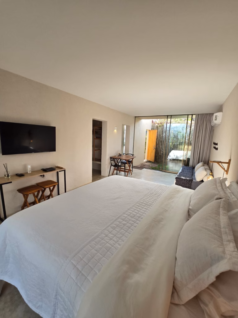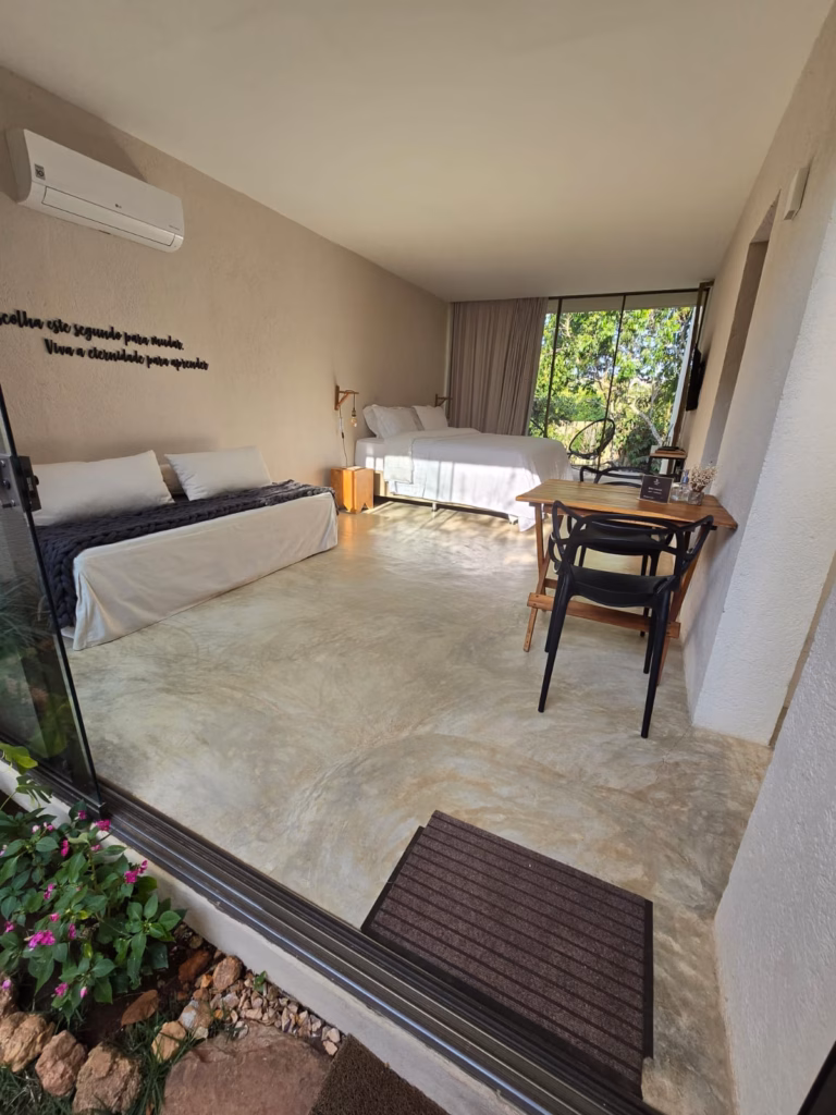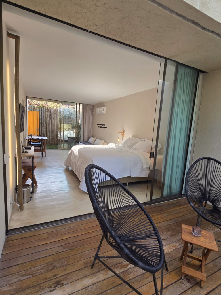 A pousada conta com apenas três apartamentos, dois deles no formato loft, e o terceiro no formato de suíte. Com mais de 50m2 os lofts possuem jardim interno, copa e deck privativos, camas king size, com a opção de montagem para duplo single. Os lofts acomodam até 4 pessoas. A suíte é uma acomodação mais compacta ideal para casais, e também muito aconchegante, cama queen size, com entrada exclusiva e deck privativo. Todas as acomodações contam com colchões extremamente confortáveis, lençóis de 1000 fios para a melhor experiência de nossos hóspedes.