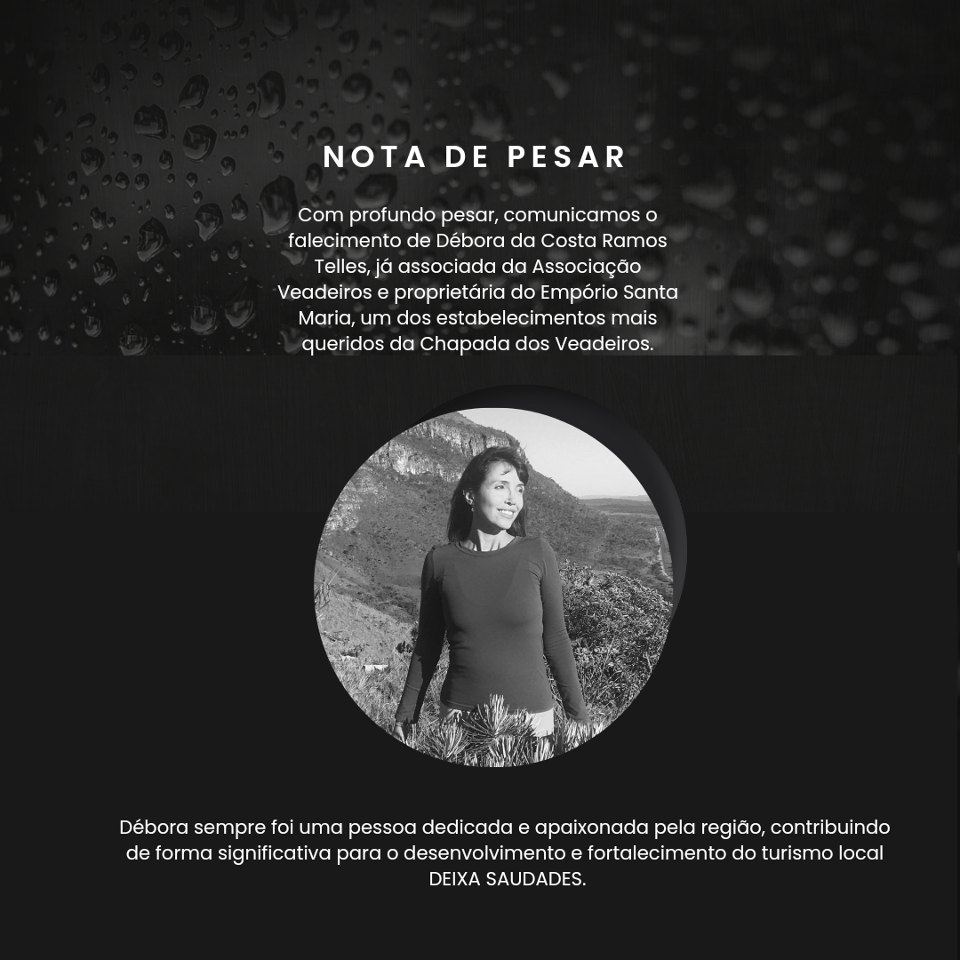 Com profundo pesar, comunicamos o falecimento de Débora da Costa Ramos Telles, já associada da Associação Veadeiros e proprietária do Empório Santa Maria, um dos estabelecimentos mais queridos da Chapada dos Veadeiros. Débora sempre foi uma pessoa dedicada e apaixonada pela região, contribuindo de forma significativa para o desenvolvimento e fortalecimento do turismo local.