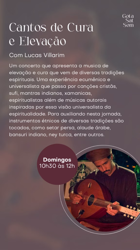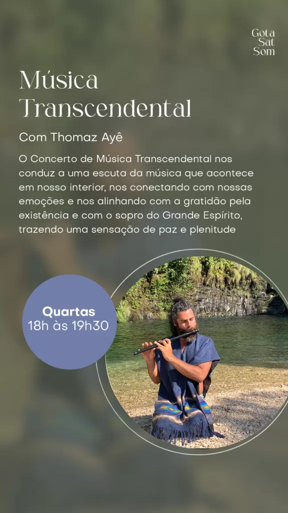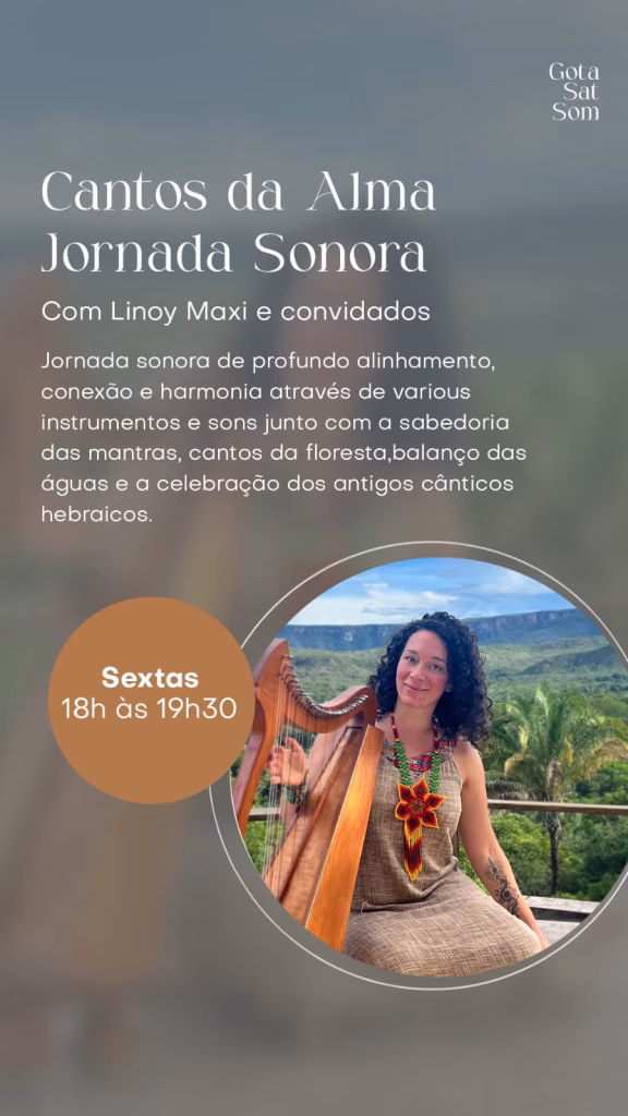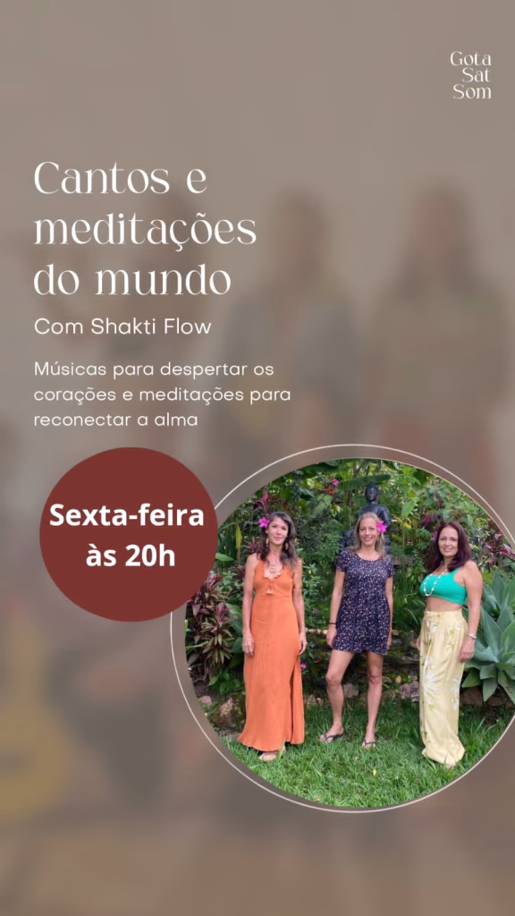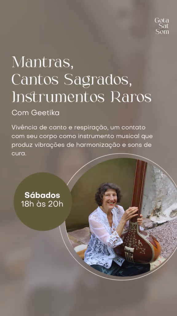 Todo Sábado às 18h na Gota Sat Som – Alto Paraíso – Canto e Respiração, vivência com contato com seu corpo como instrumento musical que produz vibrações de harmonização e sons de cura com Geetika.