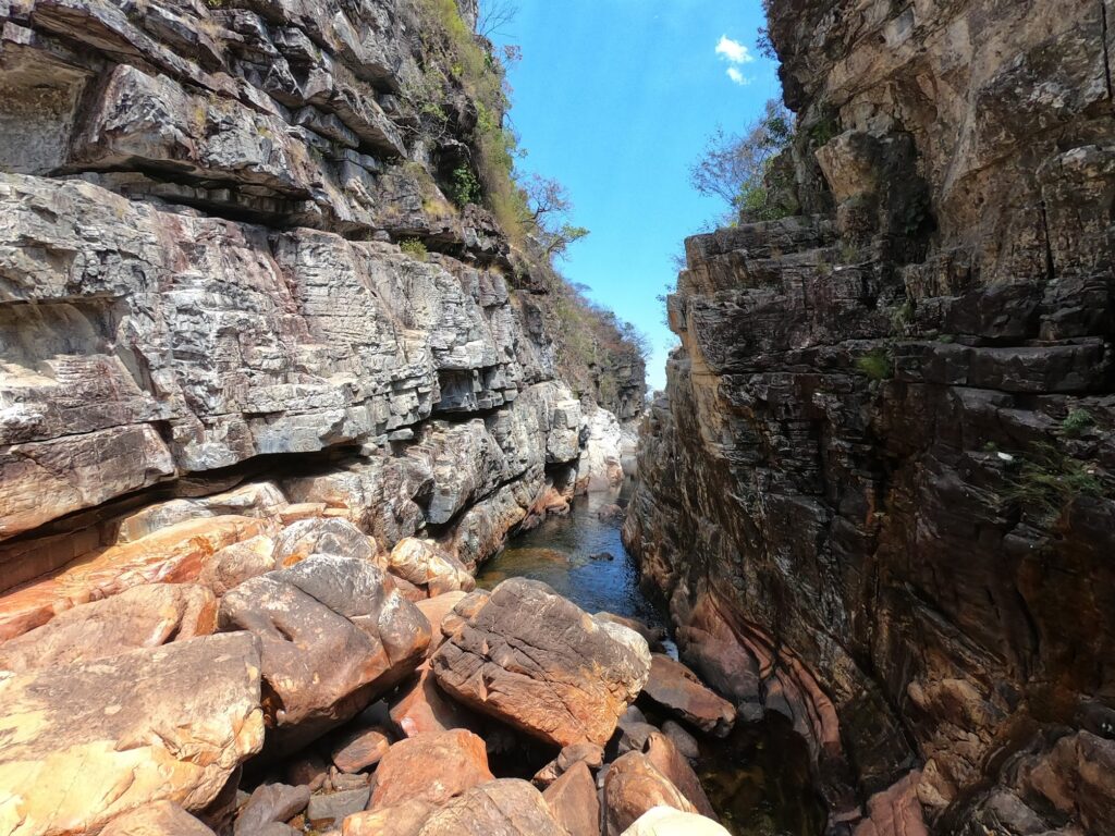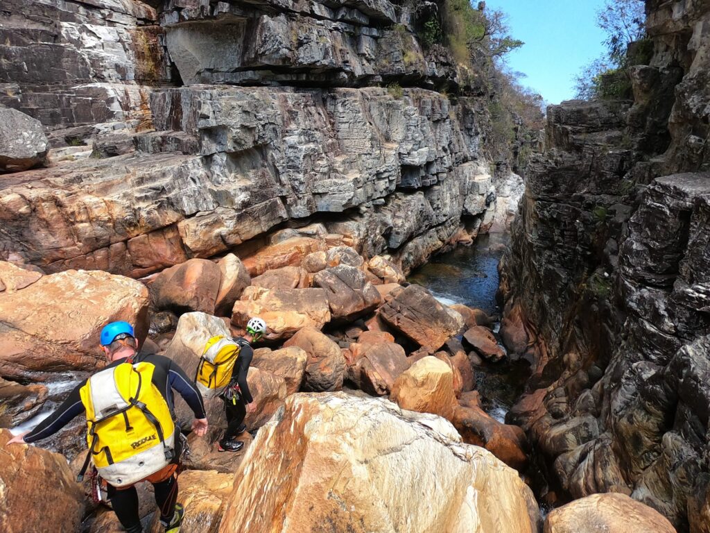 O primeiro rapel com 6M, desceremos por uma fenda escura no meio de grandes blocos, o segundo rapel logo abaixo em uma pequena cachoeira com 9m, o terceiro rapel com 10m e chegamos no Carrossel, um dos grandes atrativos do Parque Nacional da Chapada dos Veadeiros. Seguindo pelo leito do rio, há alguns trechos de desescaladas, e chegamos a entrada do grande cânion do Garimpão, atravessaremos a nado, por uma enorme piscina com aproximadamente 100m de comprimento.