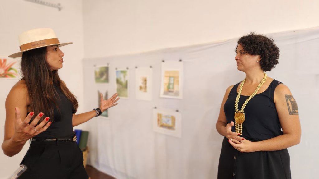 No Estúdio de Arte e Bem-Estar Camomila, a jornalista conheceu os projetos desenvolvidos com técnicas de pintura em aquarela para crianças, além dos cursos de yoga e a exposição de obras criadas com essa técnica.